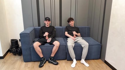 Two lads jerk off uncut dick and cum