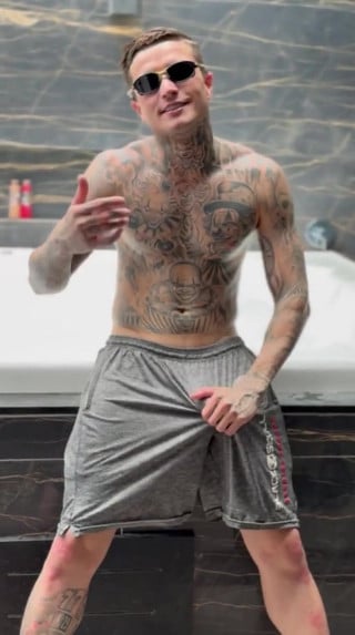 A young, skinny boy shows his circumcised penis, erecting it, pulling back the foreskin, and letting it return.